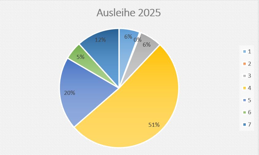 In Zahlen waren das 16 289 Besuchsvorgänge. Die Bibliothek ist wirklich sehr beliebt, würde ich sagen. Was mich aber noch mehr gefreut hat, war, dass auch die Ausleihe wieder in die Höhe gegangen ist. Der Negativtrend der letzten Jahre ist damit zumindest für 2025 gebrochen. In Zahlen waren es 1223 Ausleihvorgänge (Vorjahr nur 728). Weiterhin werden übrigens viele neue Bücher nach wie vor gerne in der Schulbibliothek gelesen und nicht mehr nach Hause genommen.